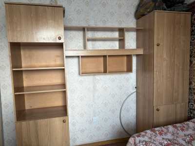 Продается детская стенка б/у, в бежевом цвете. Комплект включает шкаф с полками и отделениями для хранения вещей.