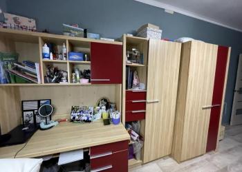 В хорошем состоянии, есть небольшие косячки на столе, вместительный, один шкаф с полками, второй со стойкой для плечиков.